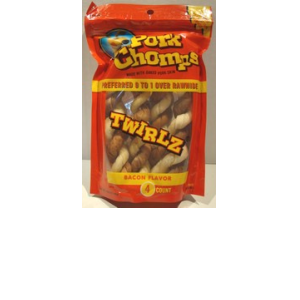 ENGLISH: Pork chomps. 4 count. Bacon twists flavor. These tasty twists are the safer alternative to rawhide that won´t stain carpet.