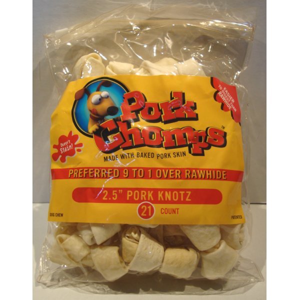 ESPAÑOL: Pork chomps. 21 unidades. Horneado. 9 de cada 10 perros lo prefieren. Satisface la necesidad de su perro para masticar, sin manchar la alfombra o los muebles.