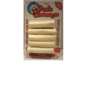 ENGLISH: Pork chomps. 5 count. Baked. Delicious baked pork skin knotted so your dog can go to workª Lower in fat than pig´s ears and more easily digestible than beef rawhide. Long-lasting knots guaranteed to satisfy your most vigorous chewer. No artificial flavors or preservatives.