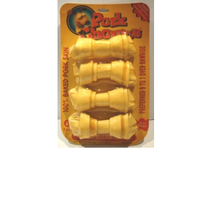 ENGLISH: Pork chomps. 4 caunt. Peanut Butter flavor. Delicious baked pork skin knotted so your dog can go to workª Lower in fat than pig´s ears and more easily digestible than beef rawhide. Long-lasting knots guaranteed to satisfy your most vigorous chewer. No artificial flavors or preservatives.