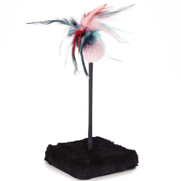 Feather-topped plush ball on a spring has a soundchip that will chirp when batted