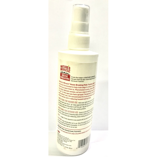 House-Breaking Potty Training Spray is specially formulated to help train dogs to relieve themselves where you want them to. Phenomenal scents, detectable only by a dogs delicate senses, act as a signal telling dogs its okay to go on the spot you have sprayed. Designed for both indoor and outdoor use, the concentrated formula provides long-lasting effects which aid in reducing housebreaking time. Attractant pheromone scent reduces time required time to housebreak your dog! Encourages dogs to go where you want them to urinate. For indoor & outdoor training. Long-lasting concentrated formula.