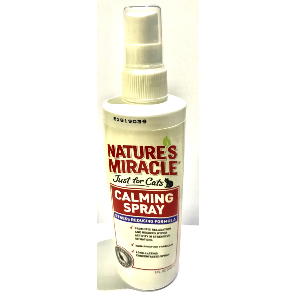 LONG LASTING CONCENTRATED SPRAY, CONTAINS SOOTHING SCENTSWHICH, WHEN SMELLED BY CATS, HELP DECREASE ANXIETY. CATSARE NATURALLY SKITTISH, THE SCENT CONTAINED IN NATURES MIRACLE CALMING SPRAY HELP DECREASE STRESS CAUSED BY CHANGES IN PETS DAILY ROUTINE, SUCH AS SEPARATION AND TRAVEL. THE FEELING IF SAFETY CREATED BY THE SCENTS WILL ALLOW CATS TO RELAX WITHOUT USING SEDATIVES.