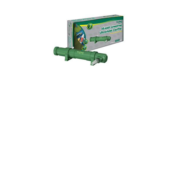 INGLES: TetraPond® GreenFree™ UV Clarifiers provide permanent control of suspended algae which cause green water. Heavy algae blooms are removed in most ponds within 5 days, keeping the pond algae free. This means water clarity is improved while reducing pond maintenance. Each unit is compact, durable, easy-to-install and energy efficient. The most efficient flow rate is 50% of total pond volume. The UV Clarifier is not submersible and should be brought in during the winter months when temperatures are at or below freezing. Designed for ponds up to 8800 gallons.