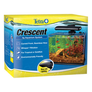 ENGLISH: Tetra. Crescent 3g Aquarium System. Crescent. Curved front, seamless view. Whisper Filtration. For tropical or goldfish. Environmentally friendly.