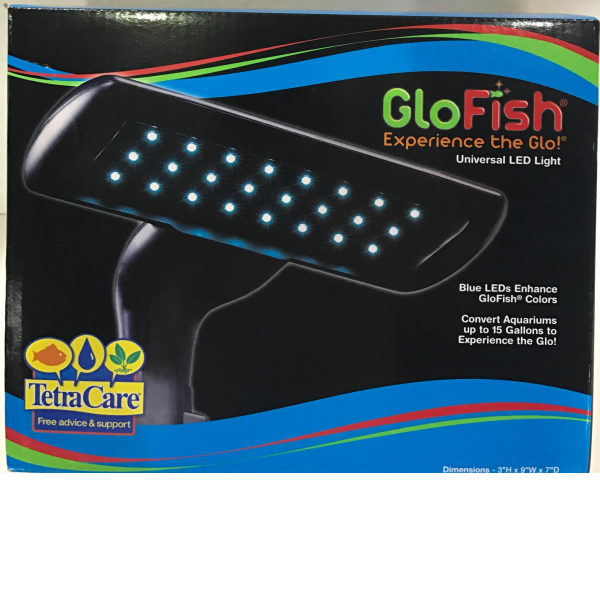 The GloFish® Universal LED Aquarium Light features an adjustable clamp to fit most standard aquariums up to 15 gallons.