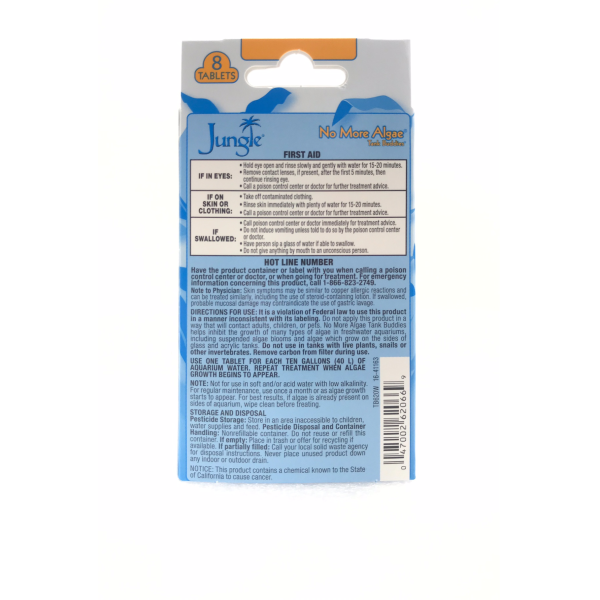 Directions for use: for aquariums and containerized ponds only. No more algae helps inhibit the growth of many types of algae in freshwater aquariums, including suspended algae blooms and algae which grow on the sides of glass and acrylic tanks. Do not use in tanks with live plants, snails or other invertebrates. Remove carbon from filter during use. Use one tablet for each ten gallons (40L) of aquarium water. Repeat treatment when algae growth begins to appear.