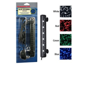 Marineland. White Led Bubble. Bubbles improved circulation and oxygenation Accent lighting adds a beautiful glow for freshwater or marine aquarium. Accent light and Bubbles, beautiful underwater lighting effects are created with the LEDs while the bubbles improve the circulation and oxygenation. Easy to Install, Accent lighting and bubbles are provided with a single piece of equipment. The 10 ft long power cord and the suction cups allow placement anywhere in the aquarium. Fully Submersible. The low voltage power adapter allows the LED bubble wand to be completely under water. Directions for Use: 1) Attack Airline Tubing (sold separately) to Air inlet on the LED bubble Wand.2.Make sure airstone is securely in place.3. Connect airline tubing to an air pump(sold separately) to prevent back siphoning.4.Connect power card to transformer.5.Position ans secure LED bubble wan, either on the bottom or back of your aquarium with repositionable suction cups.6.Plug transformer and air pump into electrical outlet. NOTE: Make a drip loop for safety.