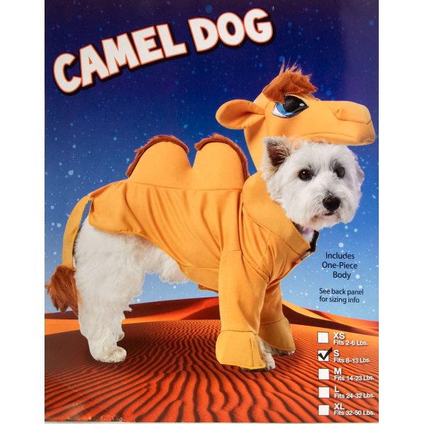 DISFRASES CAMEL DOG COSTUME SMALL 5012-S Sirve para mascotas de 8 a 13 libras Una sola pieza. Medidas: Cuello 8"-12", 20 x 30.5 cm Pecho 13"- 16", 33 x 41 cm Largo 11"-13", 28 x 33 cm